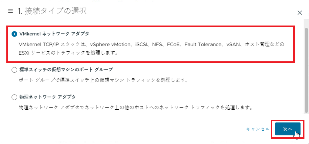 「1.接続タイプの選択」にて[VMkernel ネットワーク アダプタ]を選択し、[次へ]をクリックします