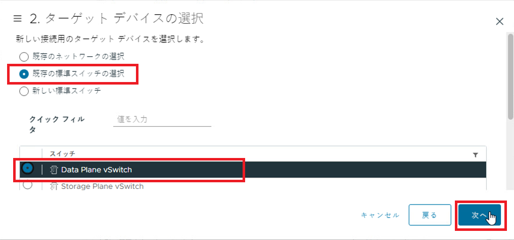 「2.ターゲット デバイスの選択」にて[既存の標準スイッチの選択]をクリックし、[Data Plain vSwitch]を選択後、[次へ]をクリックします。