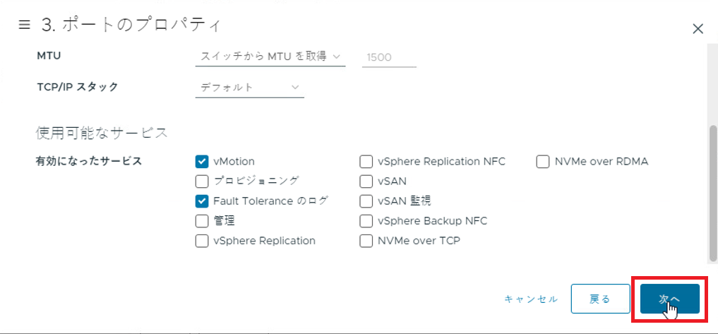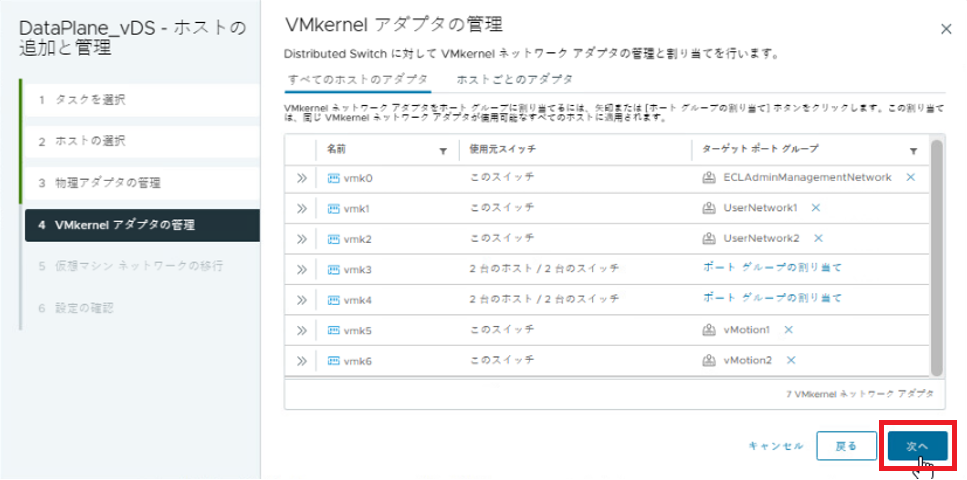 「VMkernelアダプタの管理」にて、設定を変更せず[次へ]をクリックします。