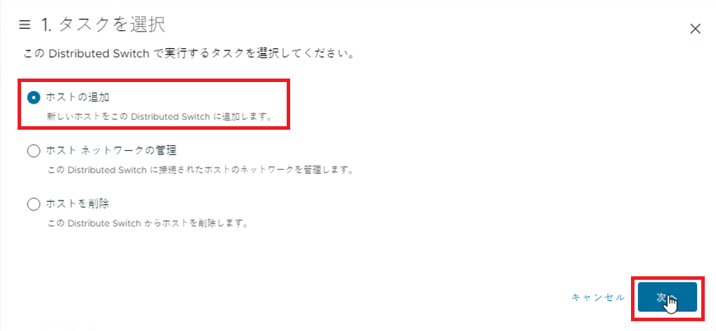「ホストの追加と管理」画面が表示されるので、「1 タスクを選択」にて[ホストの追加]を選択し、[次へ]をクリックします。