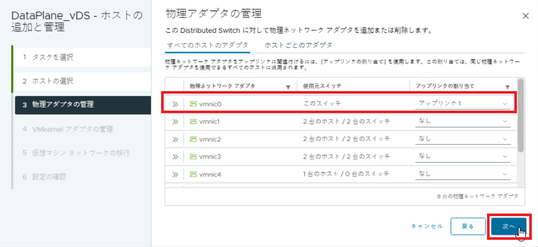 「物理アダプタの管理」にて[vmnic0]を選択し、右側の[アップリンク割り当て]のプルダウンから[アップリンク 1]を選択、[次へ]をクリックします。