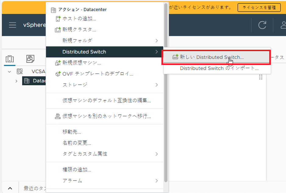 - vSphere Clientへログインし、左インベントリから、[vCenter]をクリックします。インベントリから、[vCenter]>[インベントリ ツリー]配下の[ネットワーク]をクリックします。インベントリの[Datacenter]を右クリックし、[新しい Distributed Switch]をクリックします。