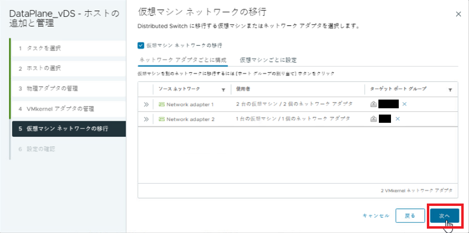 「仮想マシン ネットワークの移行」の[ネットワーク アダプタごとに指定]にて、[ソースネットワーク]ごとに対応する[ターゲット ポート グループ]を選択し[次へ]をクリックします。