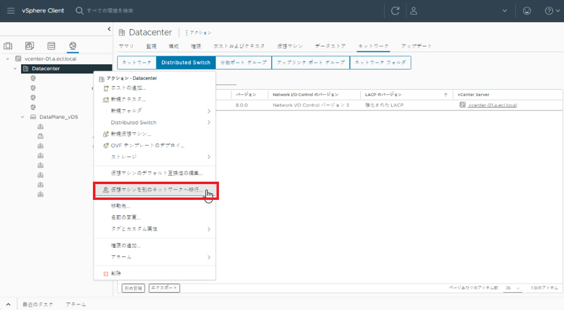 - vSphere Clientのインベントリから、[vCenter]>[インベントリツリー]配下の[ネットワーク]をクリックします。[Datacenter]を右クリックし、[仮想マシンを別のネットワークへ移行...]をクリックします。