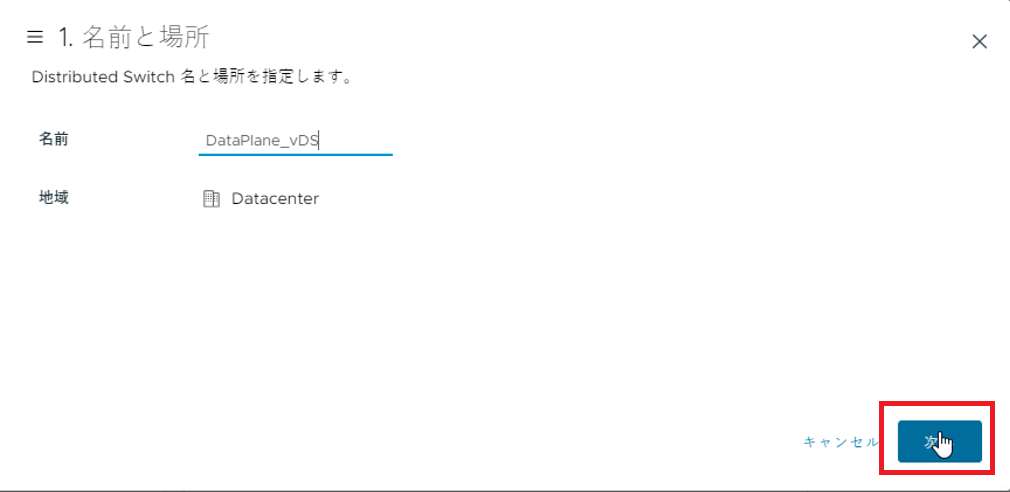 「新しい Distributed Switch」画面が表示されるので 「1.名前と場所」にて、必要事項を入力し、[次へ]をクリックします。