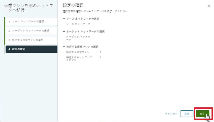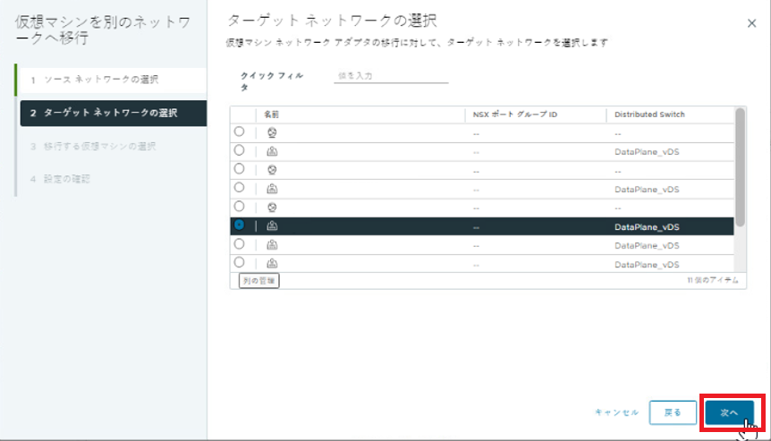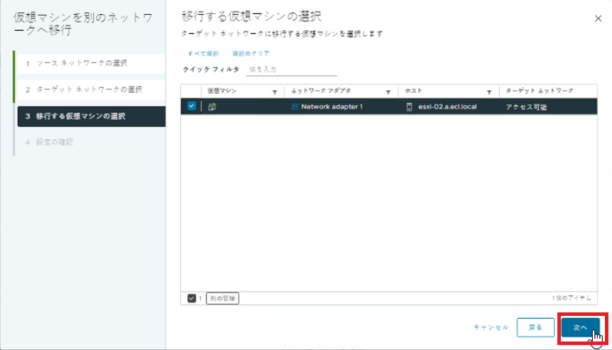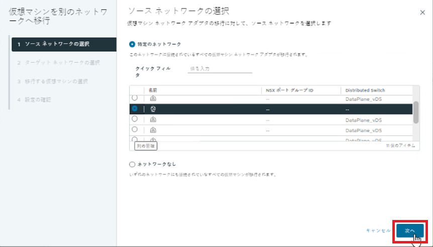 「仮想マシンを別のネットワークへ移行」画面が表示されるので、「ソース ネットワークの選択」にて対象ネットワークを選択し、[次へ]をクリックします。
