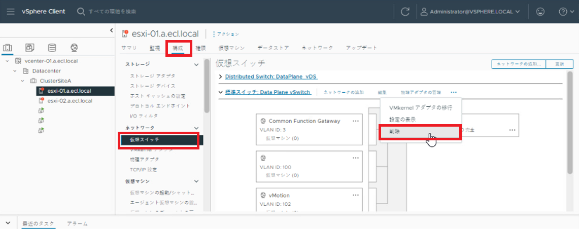 - vSphere Clientのインベントリから、[Datacenter]配下の[esxi-11.a.ecl.local]を選択し、右側ペインから[構成]タブをクリックします。[構成]タブ内の[ネットワーク]>[仮想スイッチ]をクリックします。削除対象の標準スイッチを選択し、[削除]をクリックします。