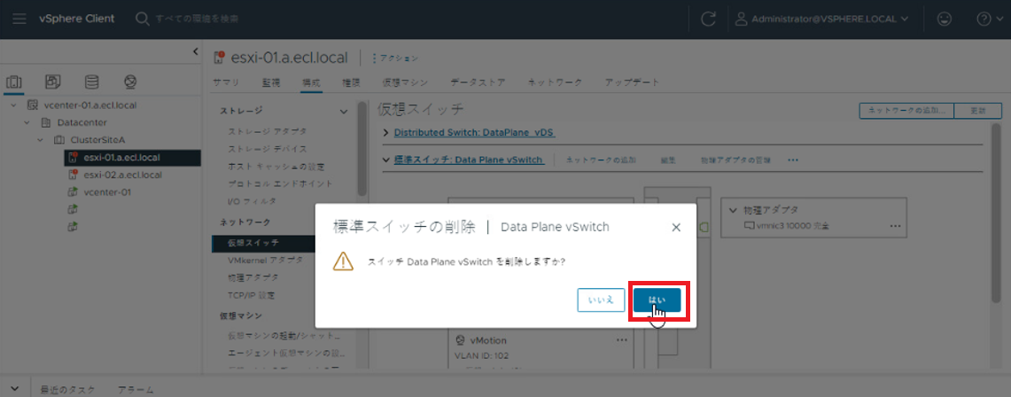 「標準スイッチの削除」画面が表示されるので、[はい]をクリックします。