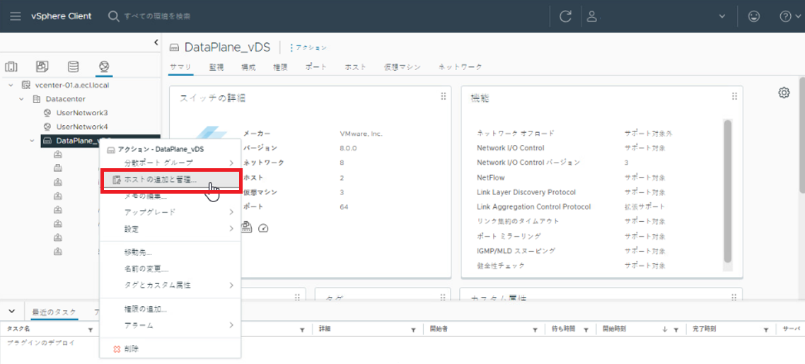 - vSphere Clientのインベントリから、[vCenter]>[インベントリツリー]配下の[ネットワーク]をクリックします。作成したvDSを右クリックし、[ホストの追加と管理]をクリックします。