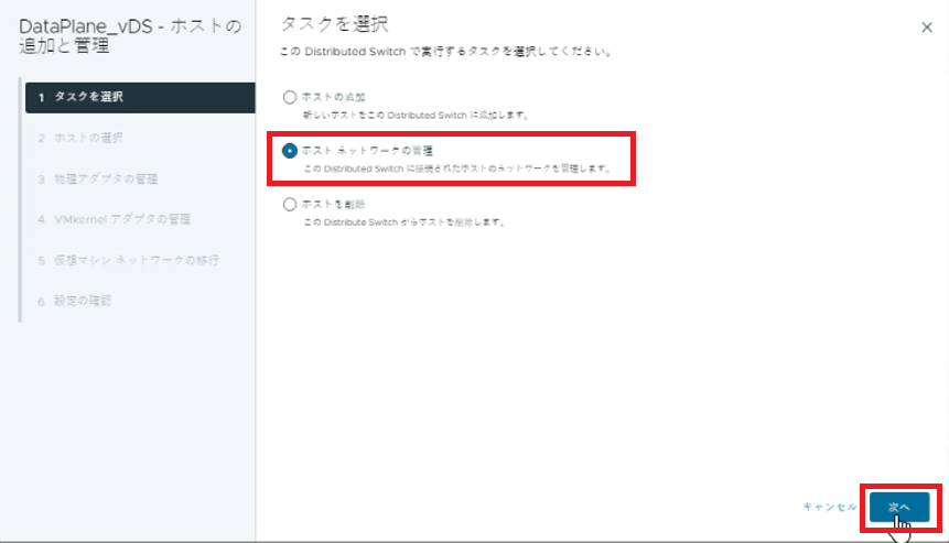 「ホストの追加と管理」画面が表示されるので、「タスクを選択」にて[ホスト ネットワークの管理]を選択し、[次へ]をクリックします。