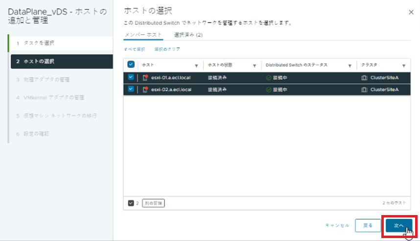 「ホストの選択」にて、[esxi-11.a.ecl.local]および[esxi-22.a.ecl.local]にチェックを入れ、[次へ]をクリックします。