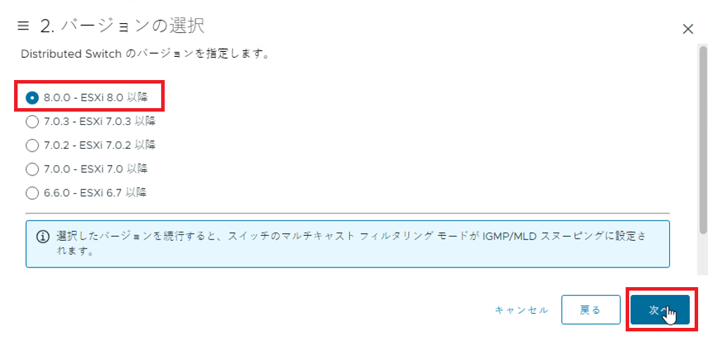 「2.バージョンの選択」にて、[Distributed switch: 8.0.0]を選択し、[次へ]をクリックします。