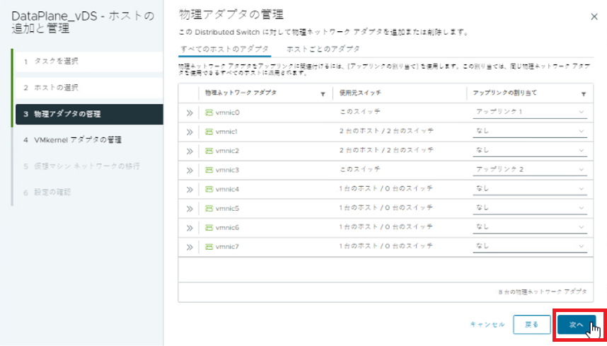 同様にすべてのESXiホストに[アップリンク]を追加し、[次へ]をクリックします。