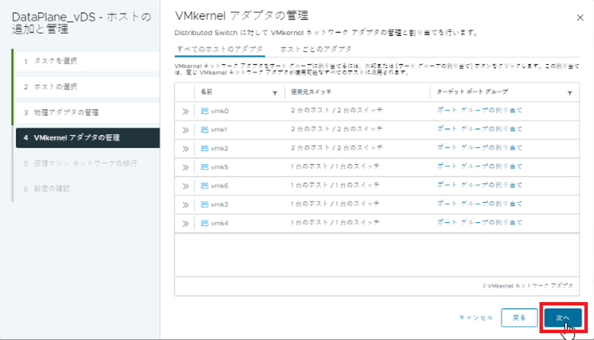 - 「VMkernelアダプタの管理」にて移行対象のVMkernelポートの[ポートグループの割り当て]をクリックし、割り当て対象となるポートグループを選択します。