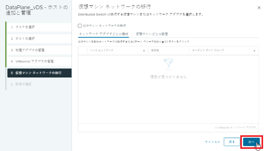 「仮想マシン ネットワークの移行」にて設定を変更せず[次へ]をクリックします。