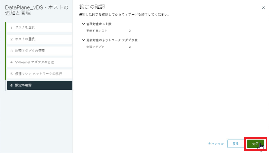 「設定の確認」にて内容を確認し、[完了]をクリックします。
