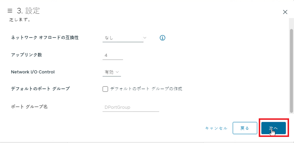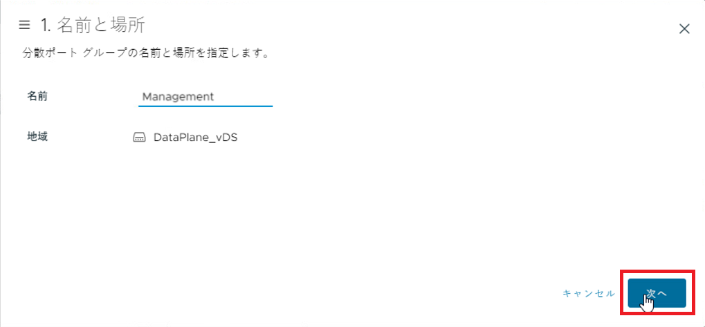 「新規分散ポート グループ」画面が表示されるので、「1.名前と場所」にて必要項目を入力し、[次へ]をクリックします。