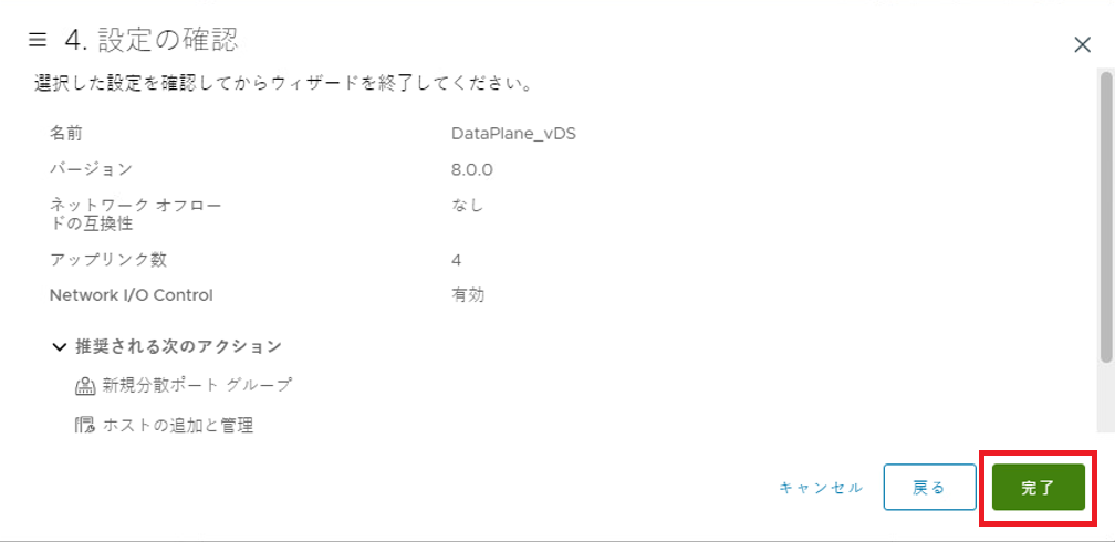 vSphereマネージメント用(データプレーン)/vSphere仮想マシン通信用(データプレーン)/vSphere vMotion用(データプレーン)/ストレージ接続用(ストレージプレーン)の合計4IDの作成完了 |