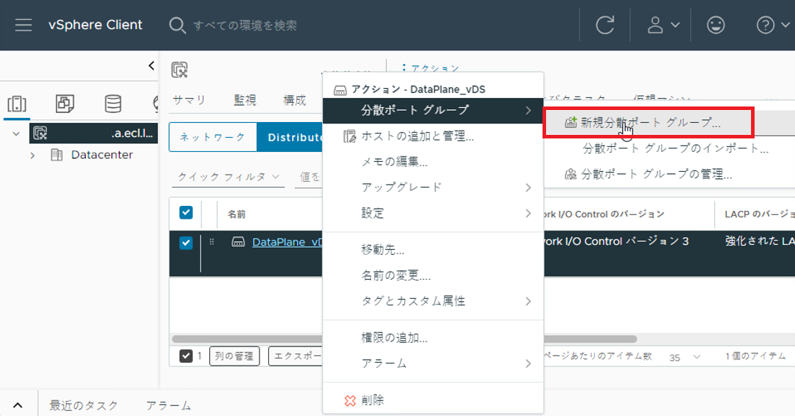 - vSphere Clientのインベントリから、[vCenter]>[インベントリ ツリー]配下の[ネットワーク]をクリックします。作成したvDSを右クリックし、[新規分散ポート グループ]をクリックします。