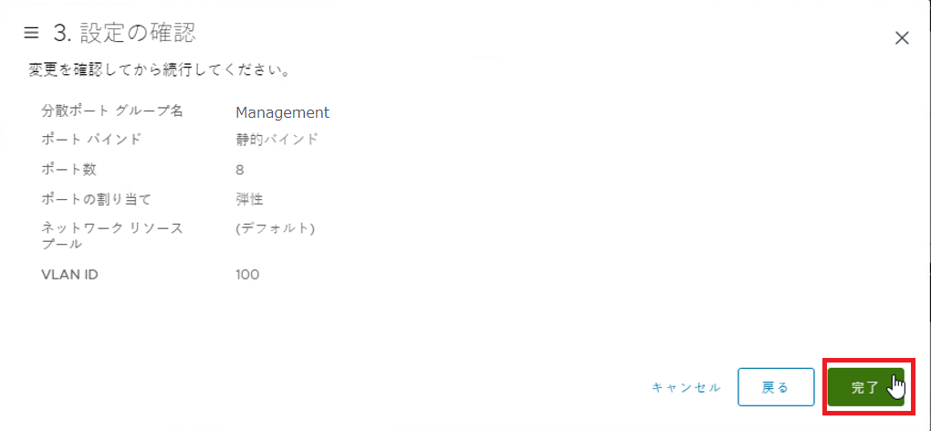 「3.設定の確認」にて設定に問題ないことを確認し、[完了]をクリックします。