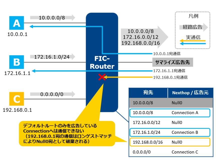 下図Cのようにデフォルトルートのみを広告しているConnectionとの通信は、ロンゲストマッチによってFIC-Routerにおいて破棄されるためご注意ください。