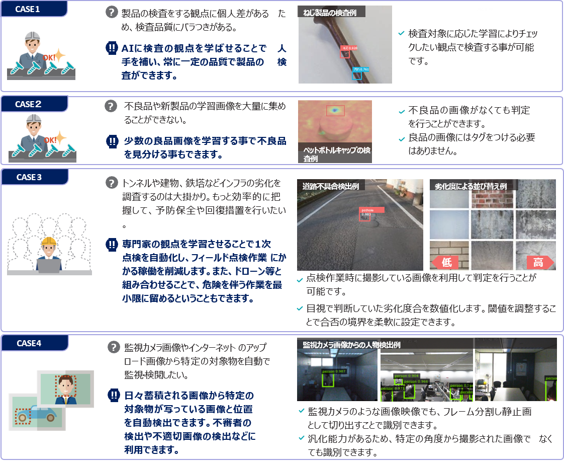 Deeptector® は、人の「目」による点検・検査・監視作業を、人の「目」に代わり実施する画像認識AIです。インフラ点検や製造業における外観検査などを中心に、さまざまな業種・業態の客さまに幅広くご利用いただいています。