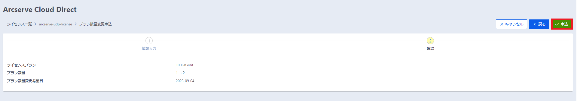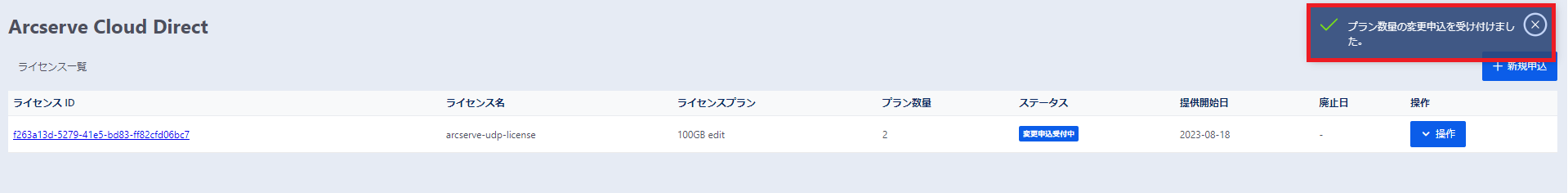 画面上部に「プラン数量の変更申込を受け付けました。」というダイアログが表示され、ライセンス画面に戻ります。