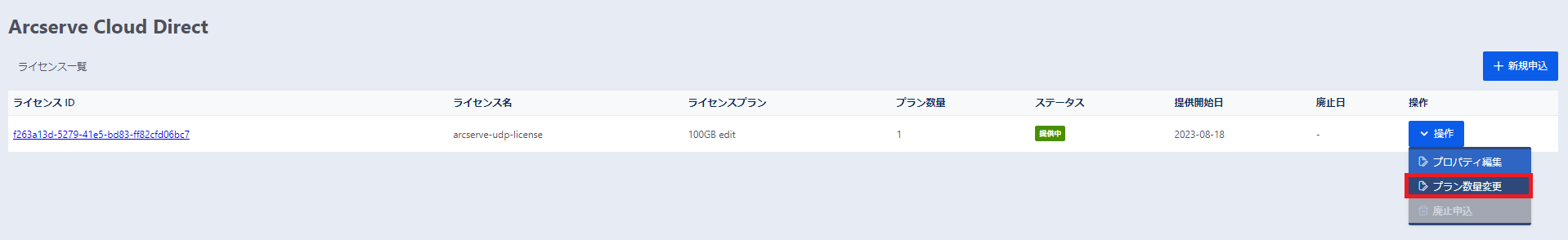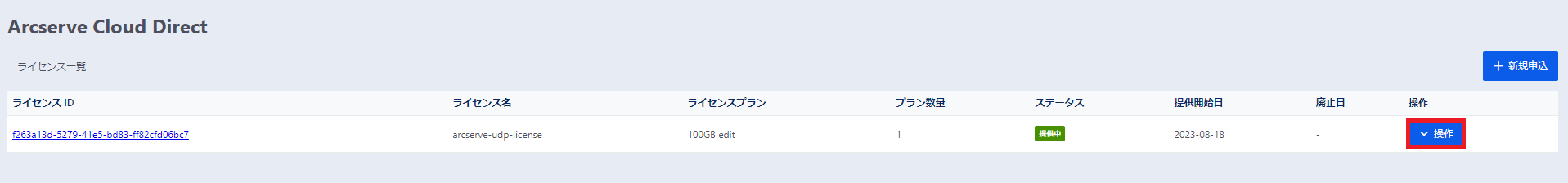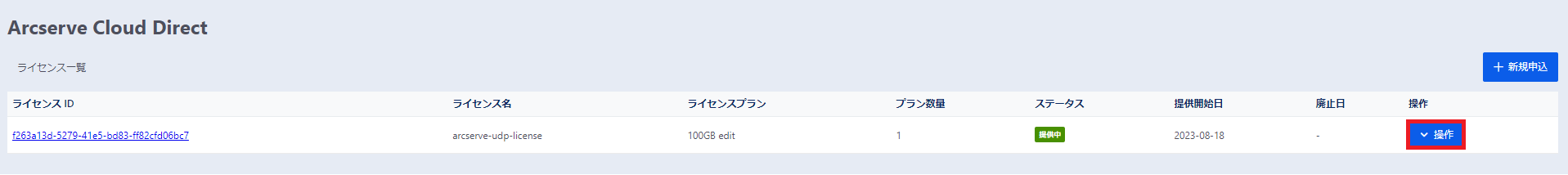 「Arcserve Cloud Directライセンス」画面にて、「ステータスが受付中または提供中で変更したい行」を選択し、「操作」ボタンを押下します。