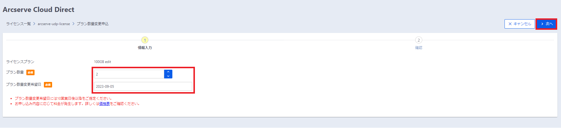 「プラン数量」に変更後のプラン数量を入力し、「プラン数量変更希望日」を入力して「次へ」ボタンを押下します。