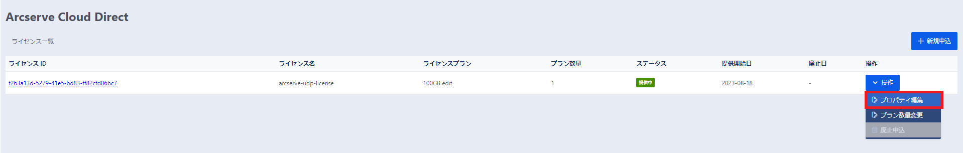 「Arcserve Cloud Directライセンス」画面にて、「ステータスが提供中で変更したい行」を選択し、「操作」ボタンを押下します。