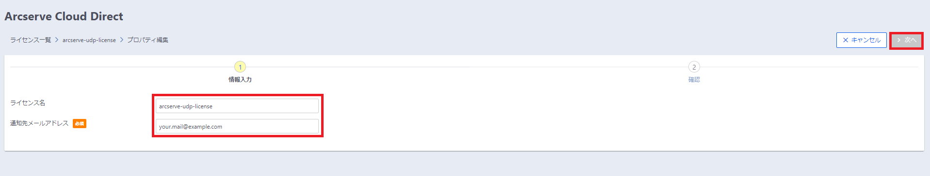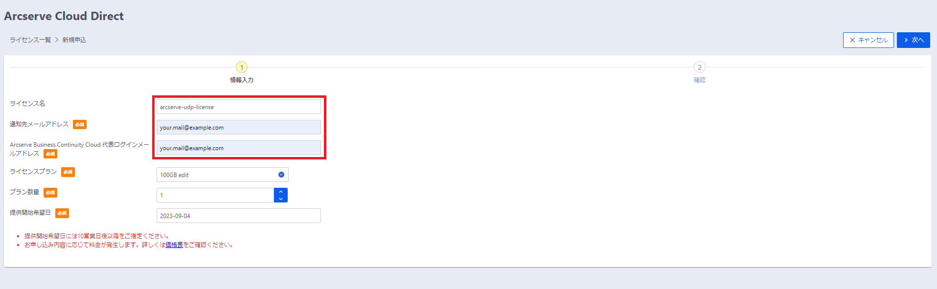「ライセンス名」「通知先メールアドレス」「Arcserve Business Continuity Cloud 代表ログインメールアドレス」を入力します。※ライセンス名は50文字までとなります。