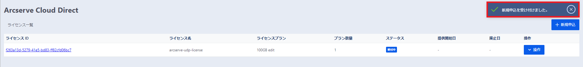 画面上部に「新規申込を受け付けました。」というダイアログが表示され、ライセンス画面に戻ります。