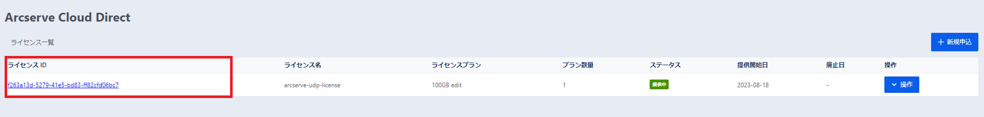 「Arcserve Cloud Directライセンス」画面にて、「ステータスが提供中でOrder ID・Fulfillment IDを確認したい行」を選択し、ライセンスIDをクリックします。
