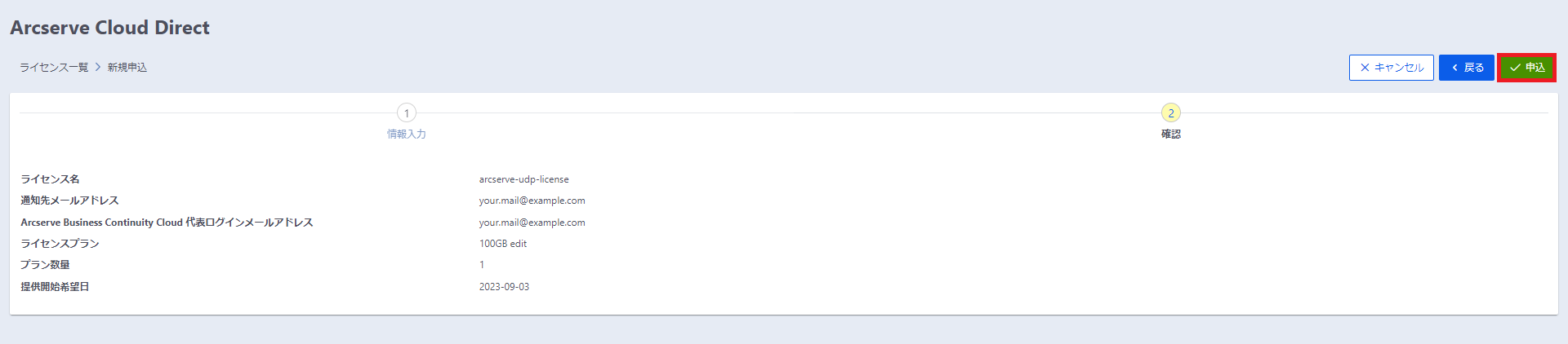 「Arcserve Cloud Directライセンス」画面が表示されます。