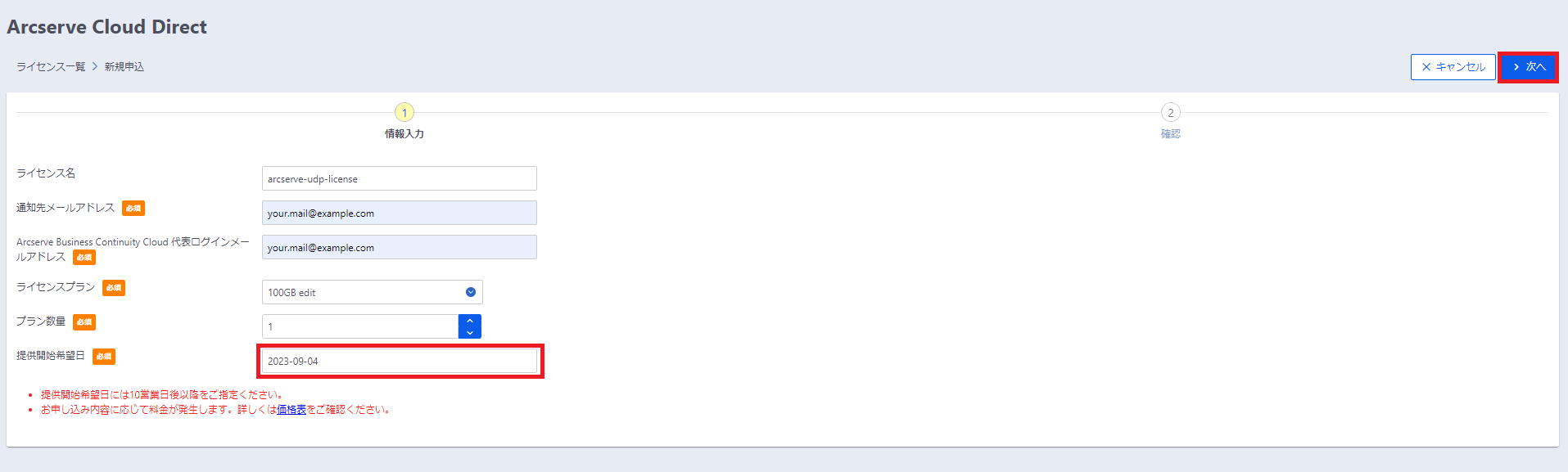 「提供開始希望日」を入力し、「次へ」を押下します。
