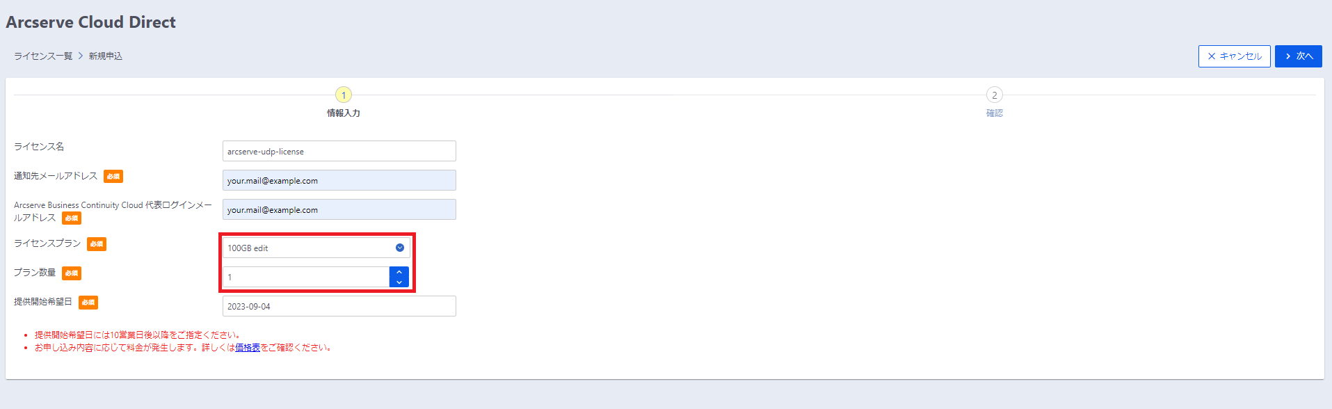 「ライセンスプラン」を「100GB」「1TB」の中から選択し、「プラン数量」を入力します。