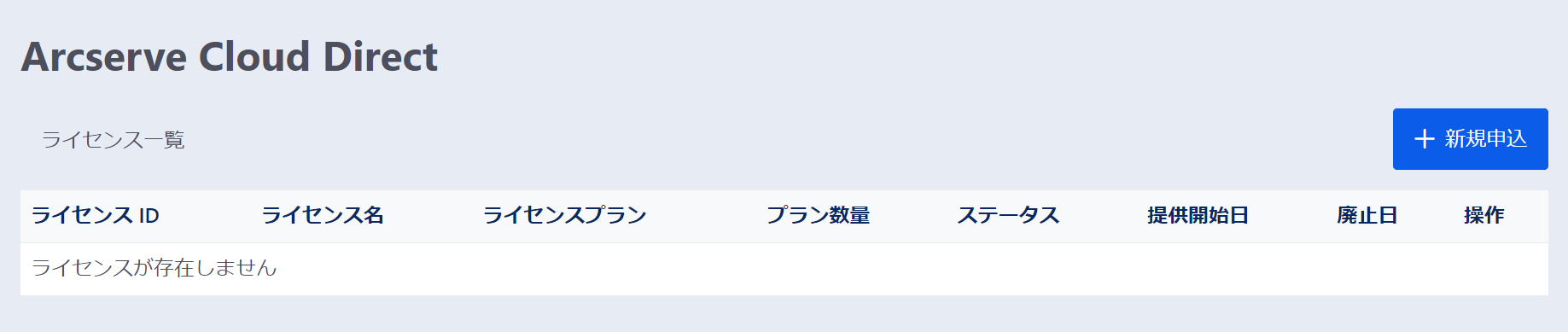 「Arcserve Cloud Directライセンス」画面にて、「新規申込」ボタンをクリックし、次画面に遷移します。