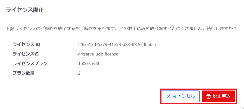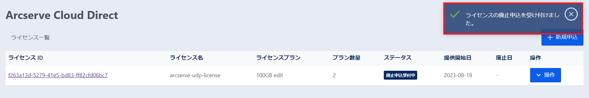 画面上部に「ライセンスの廃止申込を受け付けました。」というダイアログが表示され、ライセンス画面に戻ります。