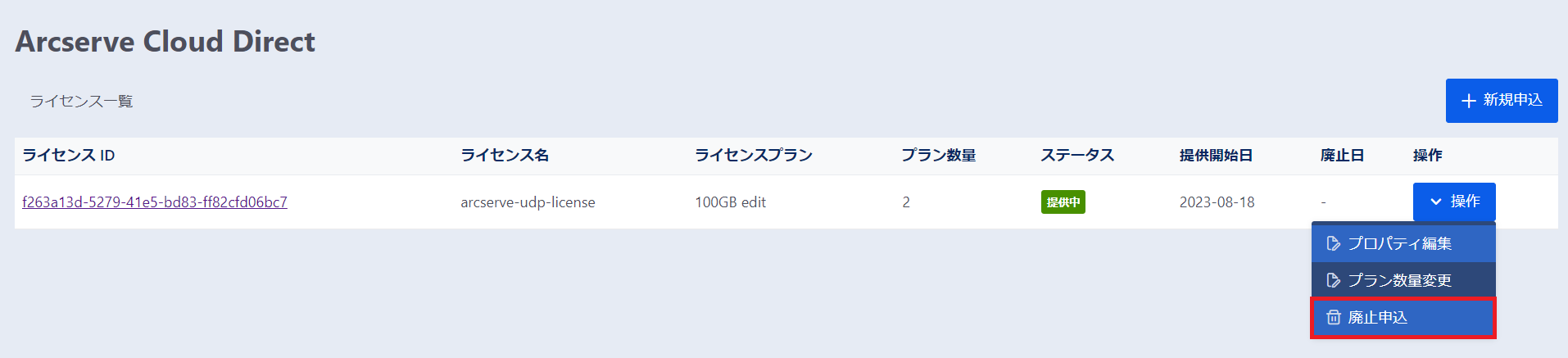 「Arcserve Cloud Directライセンス」画面にて、「ステータスが提供中で廃止したい行」を選択し、「操作」ボタンを押下します。