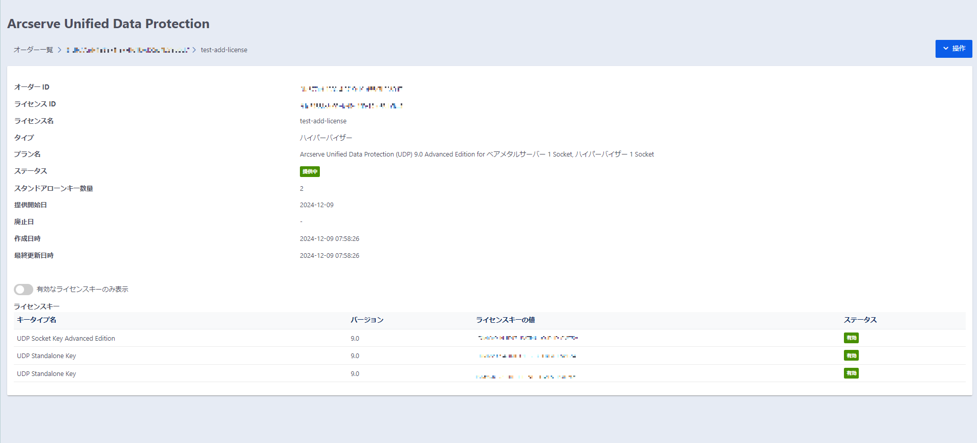 表示をONにすると、ステータスが有効なライセンスキーのみ表示されます。 |