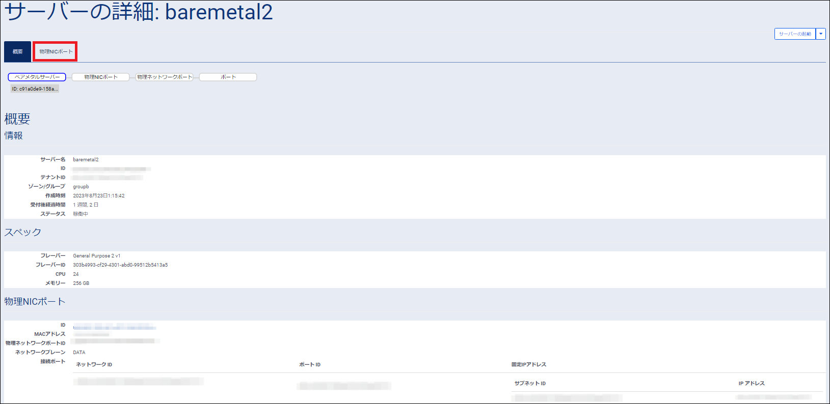 作成されたベアメタルサーバーをクリックし、サーバー概要のページから「物理NICポート」タブを選択します。