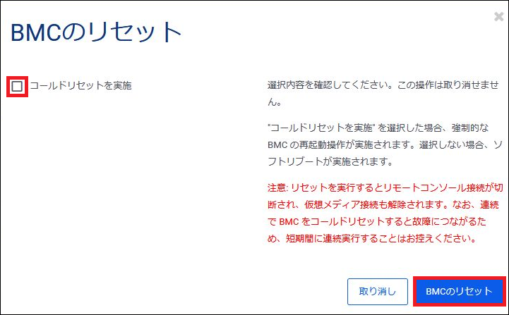 "コールドリセットを実施" にチェックを入れた場合、強制的な BMC の再起動操作が実施されます。