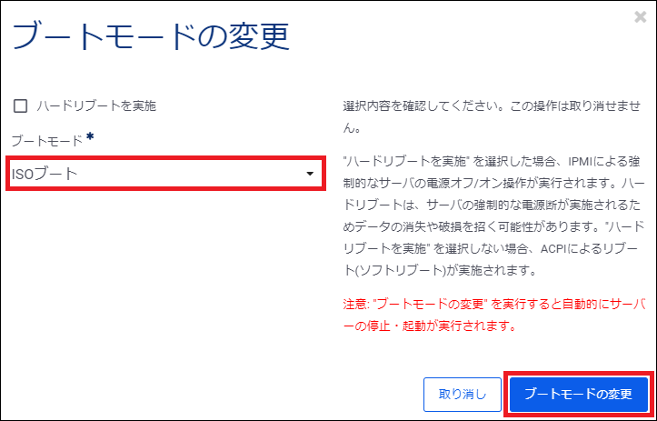 - アクションより「ブートモードの変更」を選択し、ブートモード選択ボックスより「ISOブート」を選択し「ブートモードの変更」ボタンを押下することでサーバが起動します。