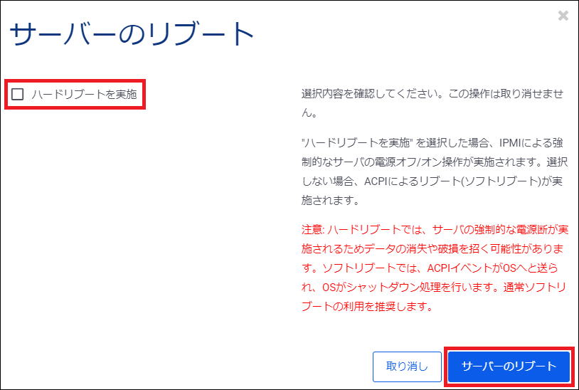 コントロールパネル上でのベアメタルサーバーの再起動操作には下記の2種類が存在します。
