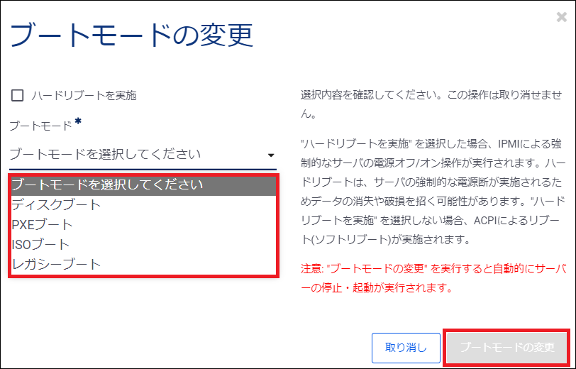 コントロールパネル上でのベアメタルサーバーのブートモード変更方法は下記の4種類が存在します。