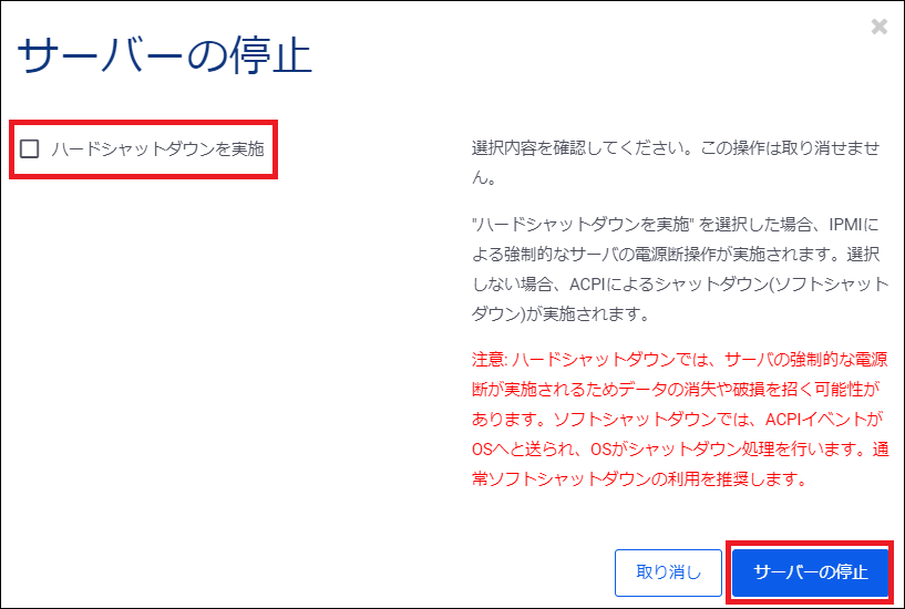 コントロールパネル上でのベアメタルサーバーの停止操作には下記の2種類が存在します。