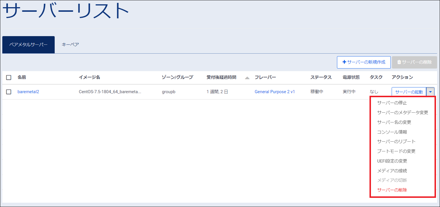 作成したベアメタルサーバーの電源操作については、ベアメタルサーバーの起動と停止、および再起動が実施できます。各種電源操作は、下記2通りの方法で実行できます。