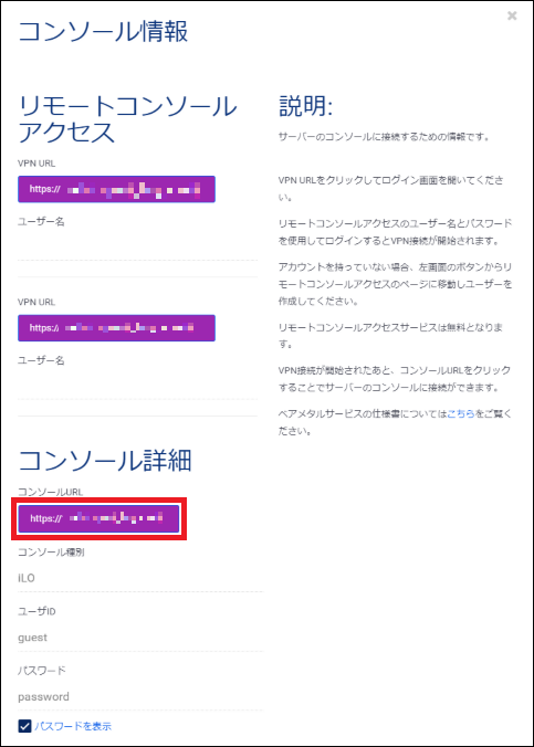 コンソール画面へログインする際のパスワードは、リモートコンソールアクセスの新規ユーザー追加でお客さま側で設定したパスワードとは異なります。初回ログイン時は、「パスワードを表示」にチェックを入れ、パスワードをご確認ください。初回ログイン後、初期パスワードを変更されることを強く推奨します。