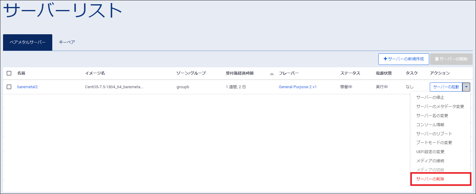 コントロールパネルから、削除対象のベアメタルサーバーを選択し、「サーバーの削除」を実行します。