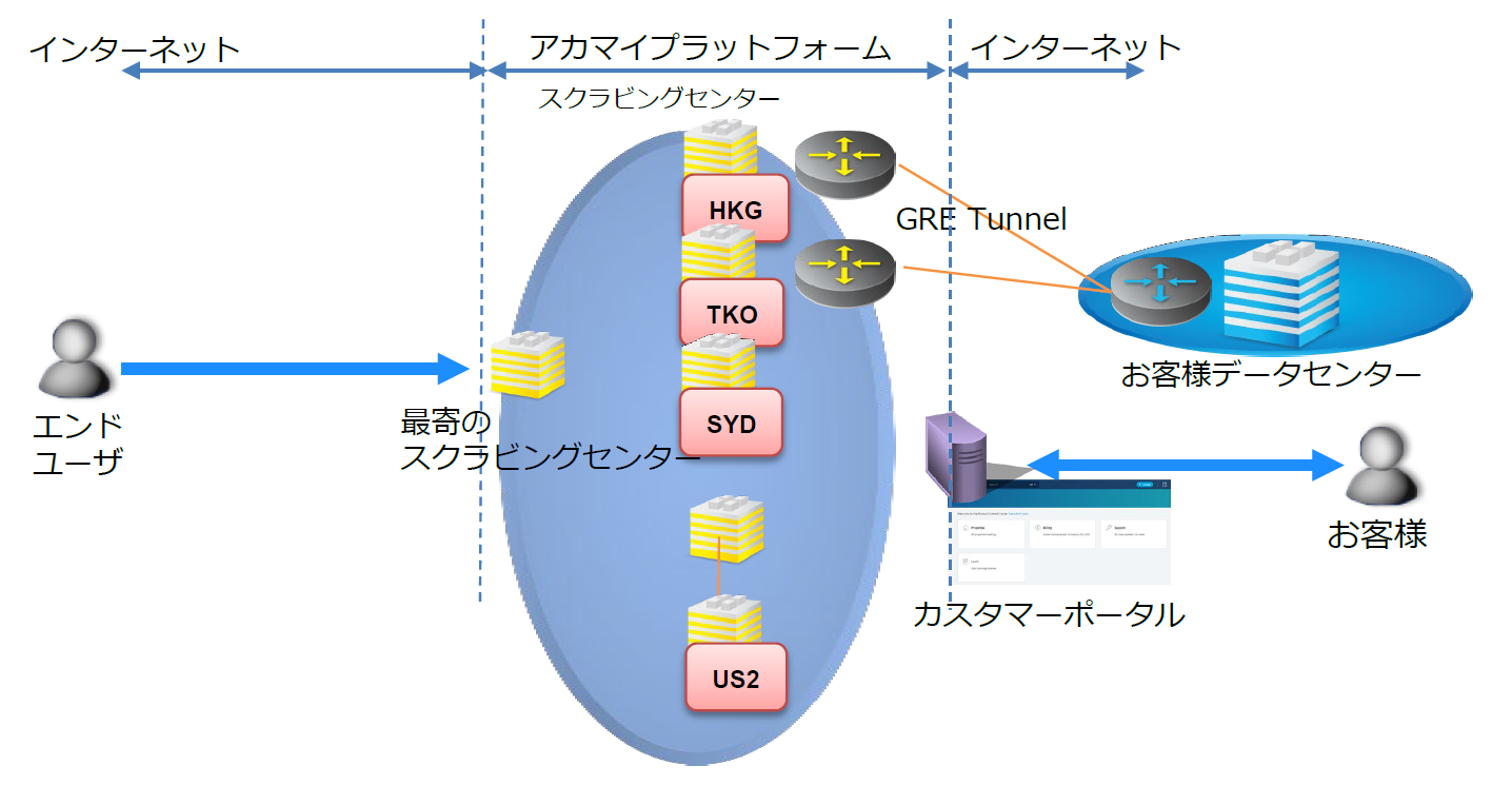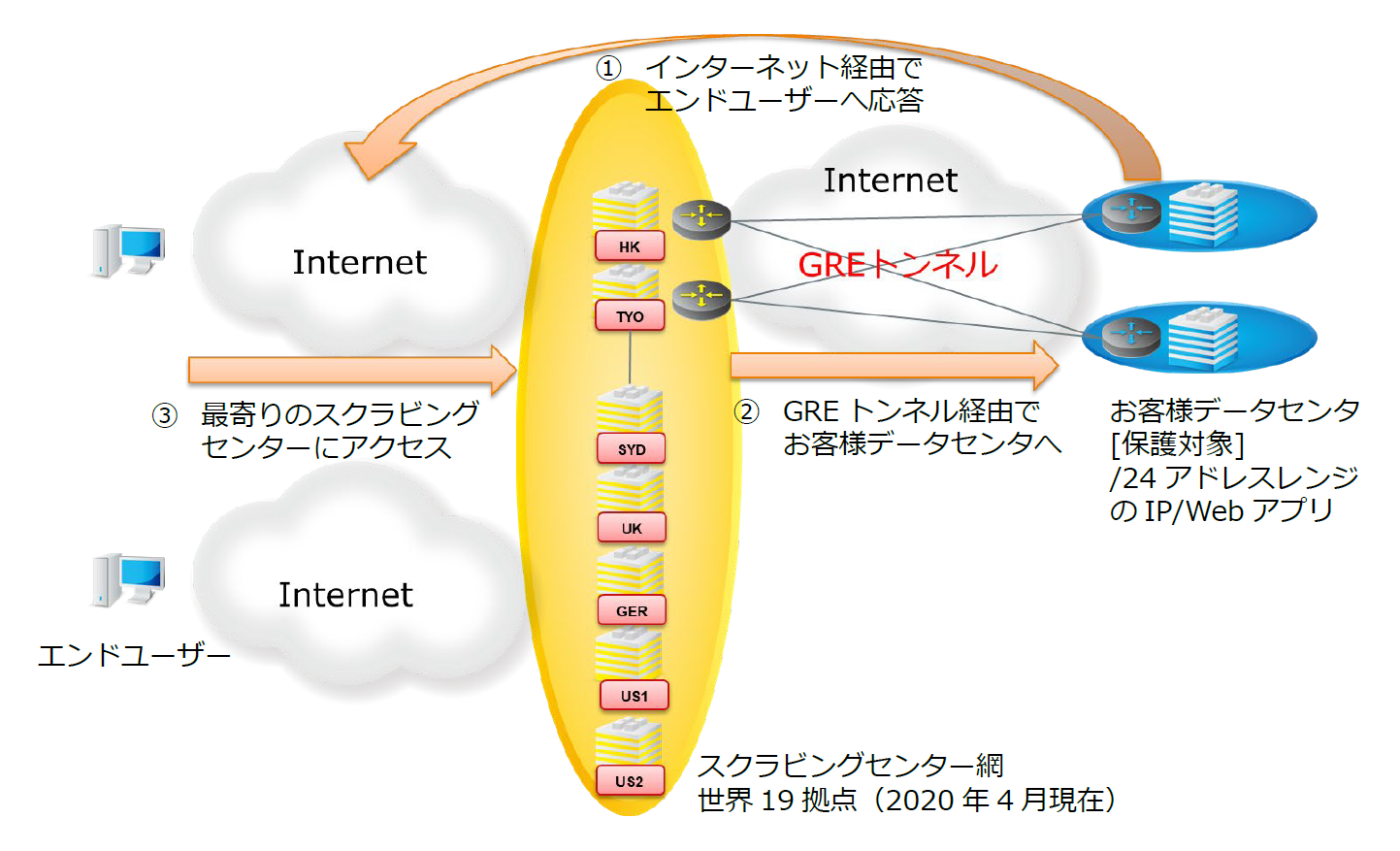 平常時はFBM(後述)でL3/4、L7のモニタリングを行い、攻撃検知時にお客様のRoute-Onによりエンドユーザーおよび攻撃者のインバウンドトラフィックを最寄のスクラビングセンターに誘導されるよう、経路広告を行います。